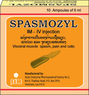 ![]() | ຊື່ການຄ້າ/Product Nam: SPASMOZYL ສ່ວນປະກອບ/ Composition Each 100ml contains: Tiemonium methyl sulfate(TMS) 10mg Metamizole sodium 2,000mg ຂະໜາດ Size: 5ml ການບັນຈຸ / Packaging: 10 amp x 144 box / carton ຄຸນປະໂຫຍດ/ Indication- -ເປັນຢາແກ້ອາການເຈັບປວດເນື່ອງຈາກການປັ້ນຂອງກ້າມເນື້ອກ້ຽງເຊັ່ນ: ກະເພາະລໍາໄສ້, ພົກຍ່ຽວ, ມົດລູກ, ຈຸກສຽບແໜ້ນທ້ອງຈາກການປັ້ນຂອງກະເພາະ ແລະ ລໍາໄສ້, ທາງເດີນອາຫານ, ຈຸກສຽບຍ້ອນໜິ້ວຖົງບີ, ພົກຍ່ຽວອັກເສບ, ເຈັບທ້ອງບິດ, ປວດປະຈໍາເດືອນ, ເຈັບປັ້ນຮຸນແຮງ- ໃຫ້ຢາກຽມກ່ອນການກວດ Endoscopique | ວິທີການນໍາໃຊ້ / Dosage - ໃຊ້ກັບຜູ້ໃຫຍ່ (ໄລຍະເວລາໃຊ້ 10 ວັນ ຫຼື ຫຼາຍກວ່າ), 3 ຫຼອດ/ມື້ (ຖ້າຈໍາເປັນສາມາດໃຊ້ໄດ້ເຖິງ 6-8 ຫຼອດ/ມື້)- Use for adult (between 10 days or more), 3 amps/day. (The dose may be increased u |